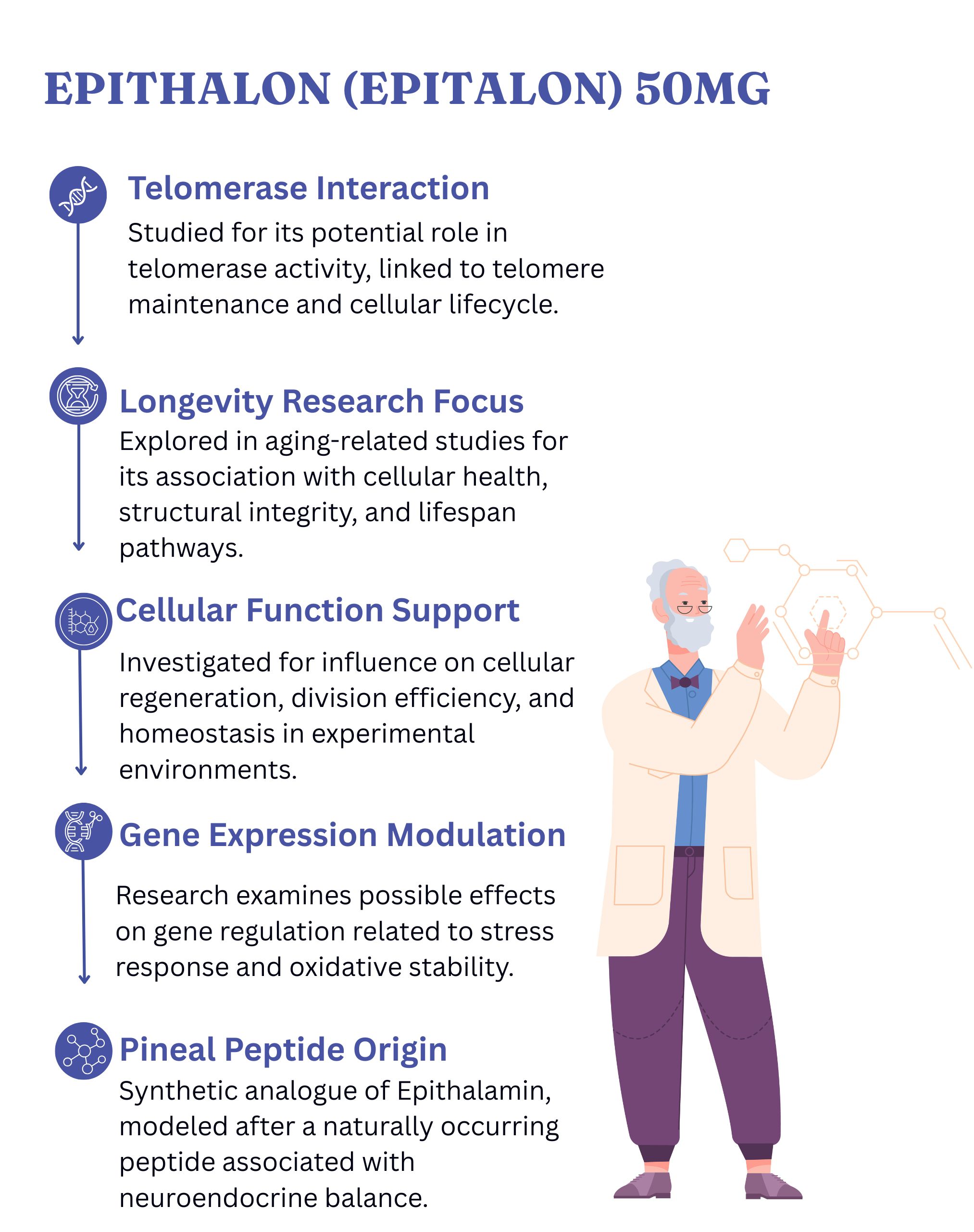 Epithalon (Epitalon) is a synthetic derivative of Epithalamin and a peptide studied for its potential interaction with telomerase, an enzyme involved in maintaining telomere length at the ends of chromosomes. Research has focused on its possible role in supporting cellular function and longevity-related processes.