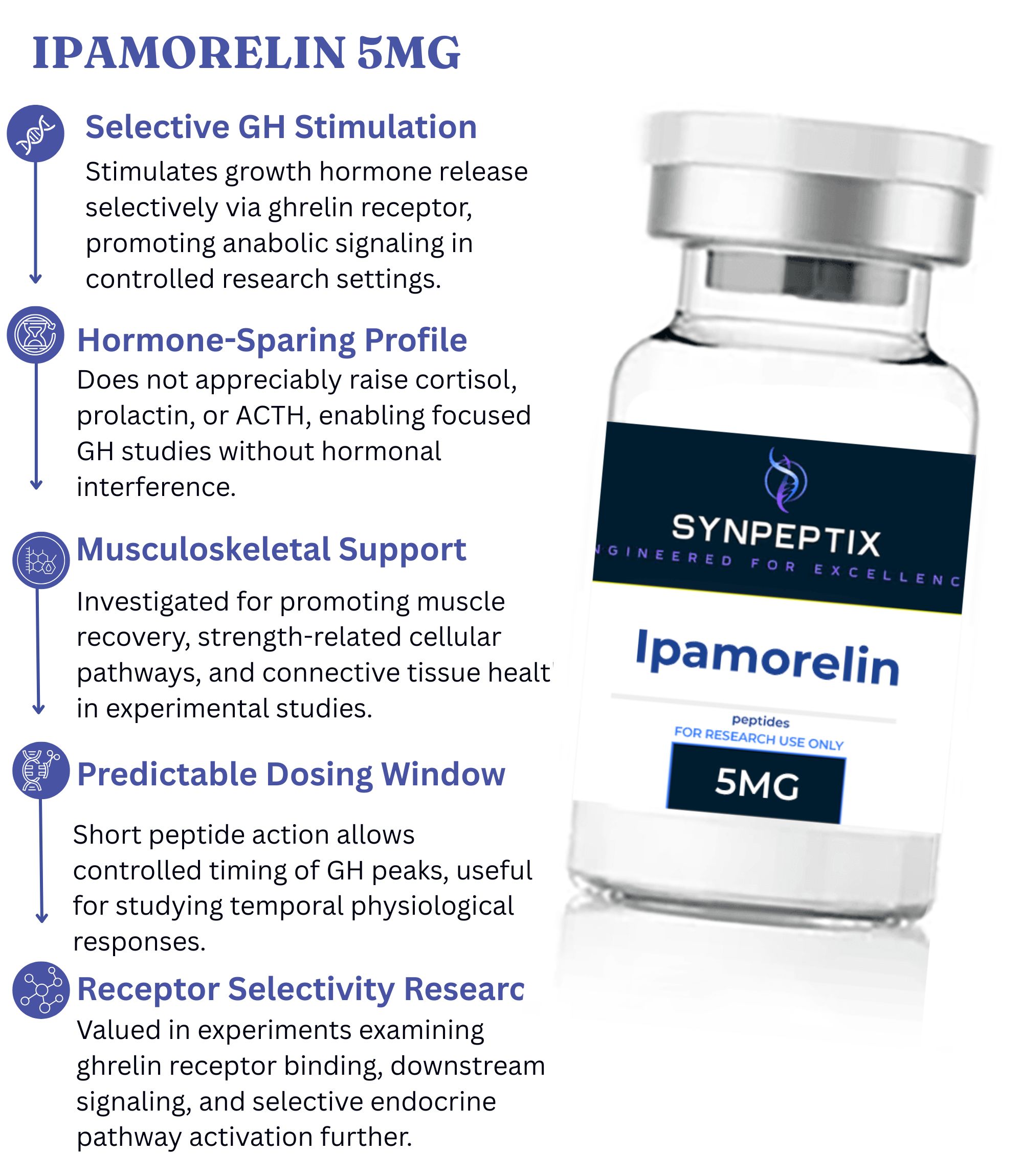 Ipamorelin is a short peptide sequence that interacts with the ghrelin/growth hormone secretagogue receptor. It is recognized for its high selectivity and has been studied for its ability to stimulate GH release without affecting other hormones such as ACTH, prolactin, or cortisol. Due to this specificity, Ipamorelin is of interest in research exploring peptide-receptor selectivity and its potential influence on cellular growth and musculoskeletal function in controlled studies.