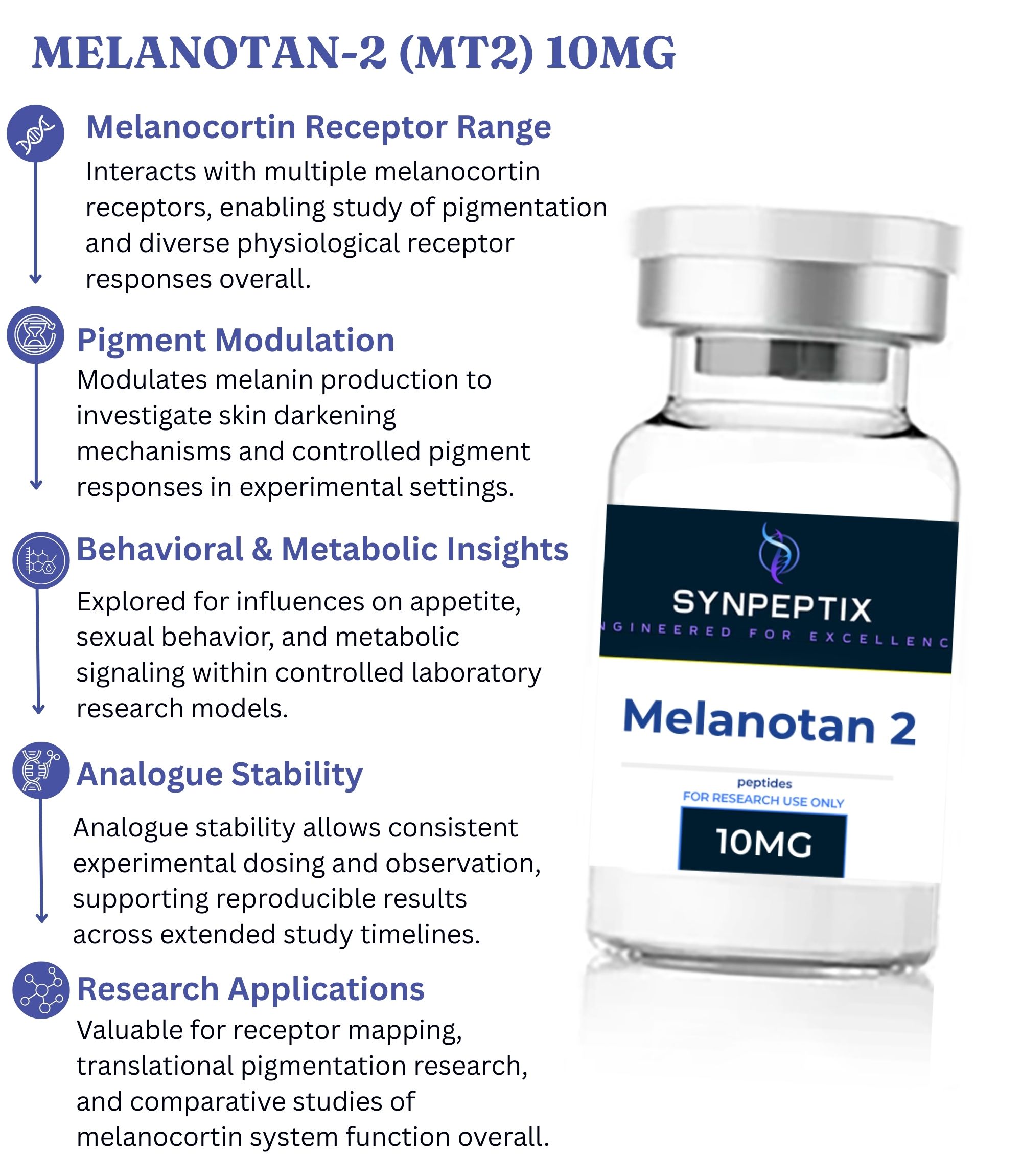 Melanotan-2 (MT-2) is a synthetic analogue of alpha-melanocyte-stimulating hormone (alpha-MSH). It has been studied for its ability to interact with melanocortin receptors involved in pigmentation and certain behavioral or metabolic processes. Research on Melanotan-2 has primarily focused on understanding its role in melanin production and its broader effects within the melanocortin signaling system.