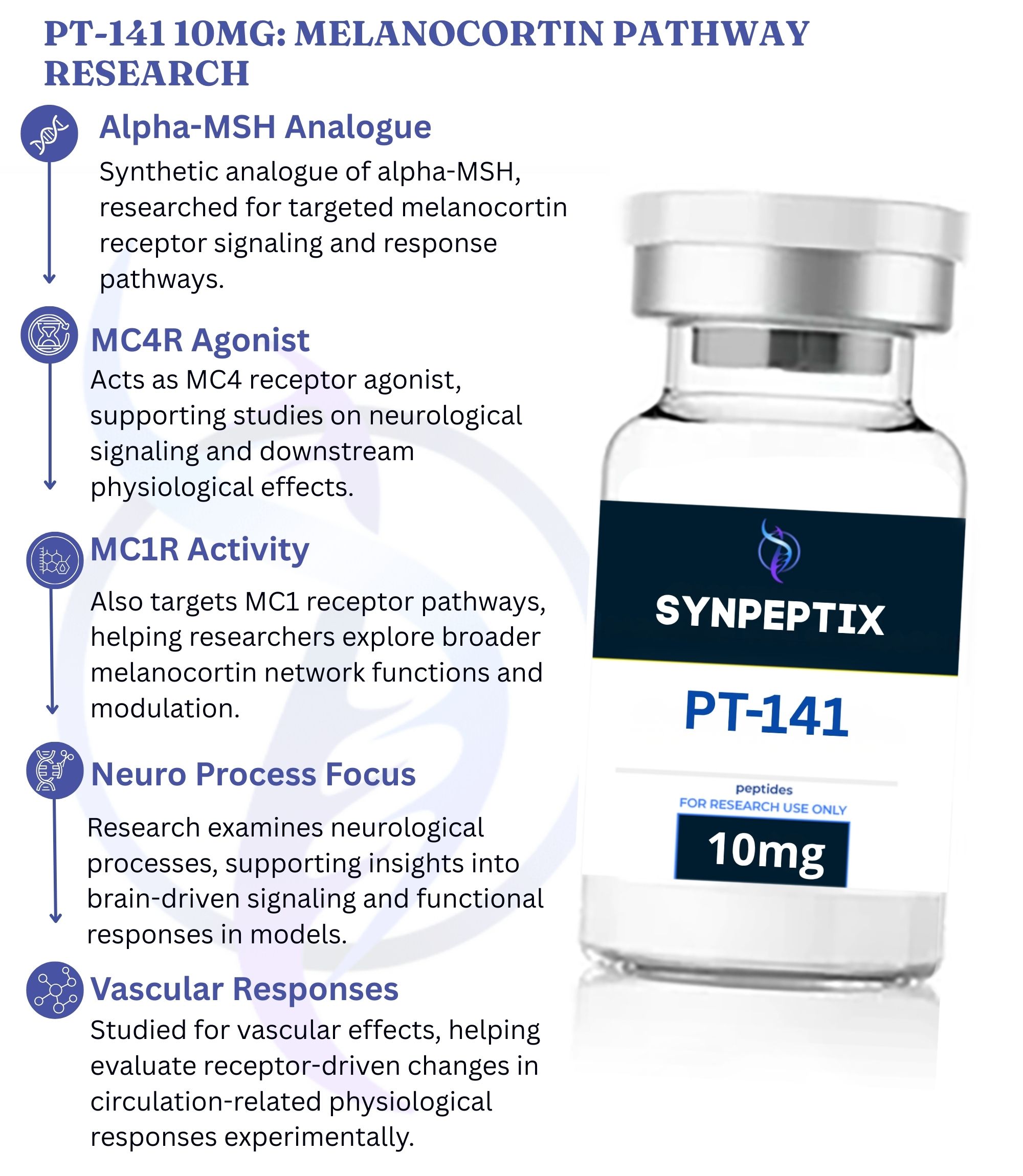 PT-141, also known as Bremelanotide, is a synthetic analogue of the alpha-melanocyte-stimulating hormone. It functions as an agonist for melanocortin-4 and melanocortin-1 receptors and has been studied in clinical and preclinical settings for its effects on receptor signaling and physiological responses. Research has primarily focused on its potential roles in neurological and vascular processes, as well as its broader impact on melanocortin receptor pathways.